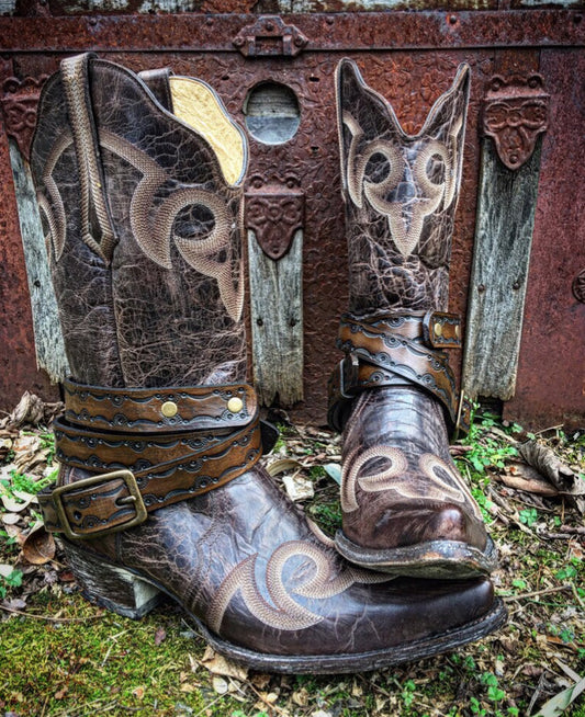 OLD WEST Boot Straps, Hand Tooled Veg Tanned Leather