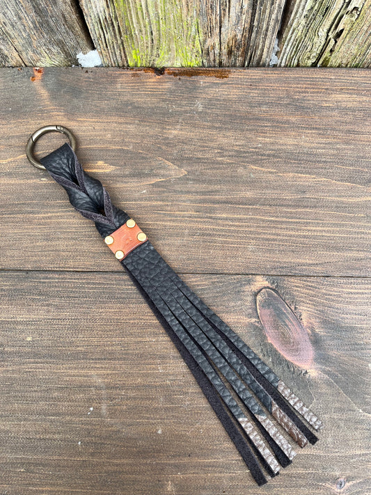 Twisted Fox Tag Leather Tassel with Black & Brown Ombré Fringe
