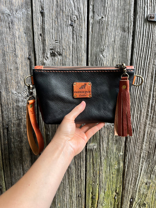 Pipsqueak Wristlet/Crossbody in Black Veg Tan with English Tan Leather Accents