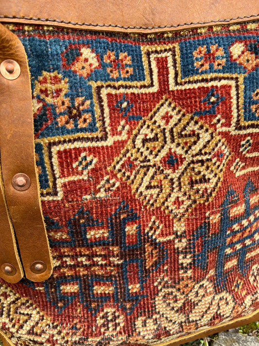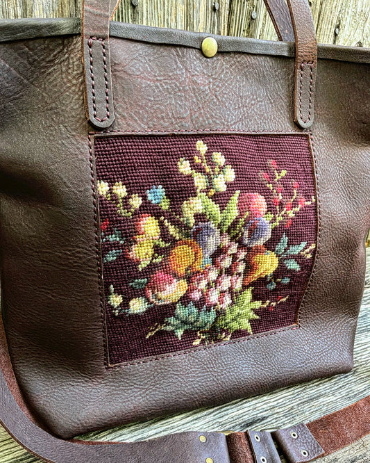 Premium Oil Tanned Leather Tote with Vintage English Needlepoint