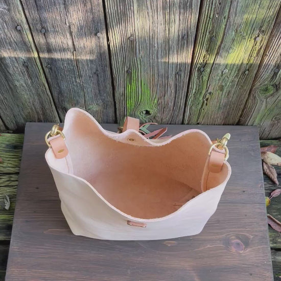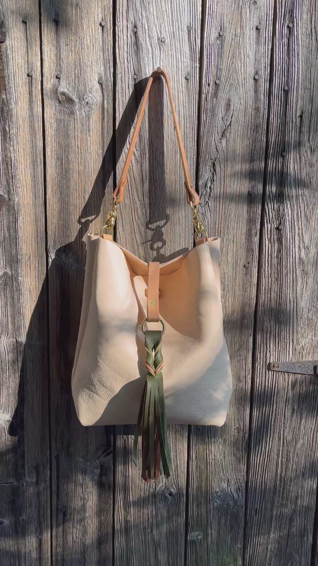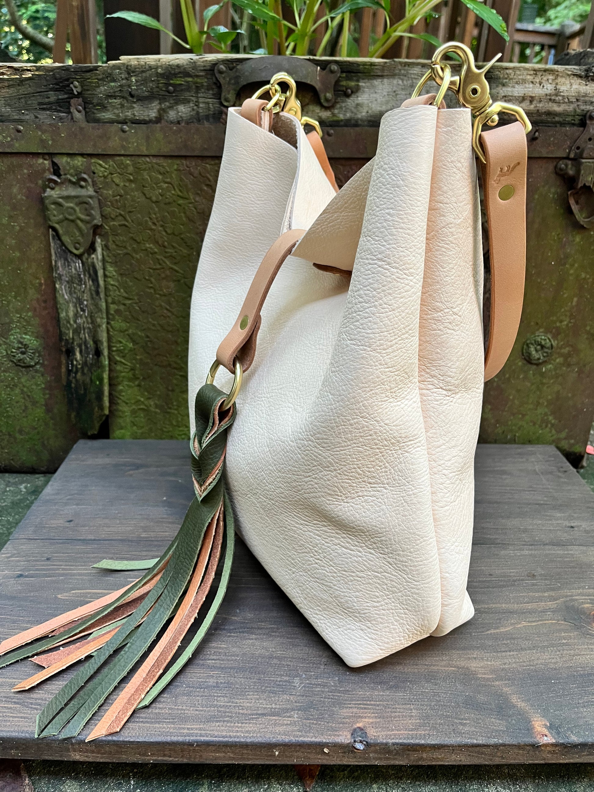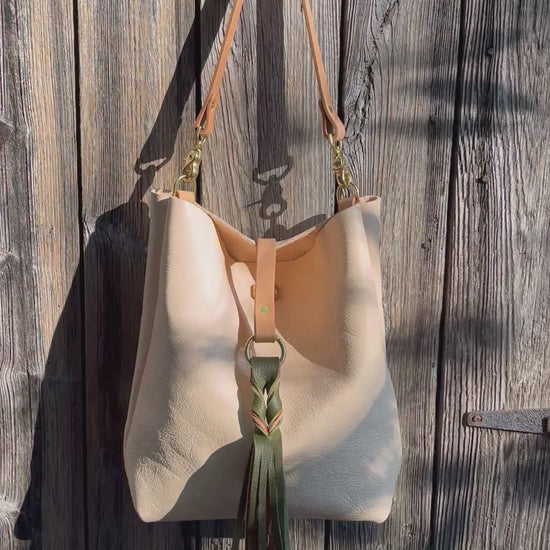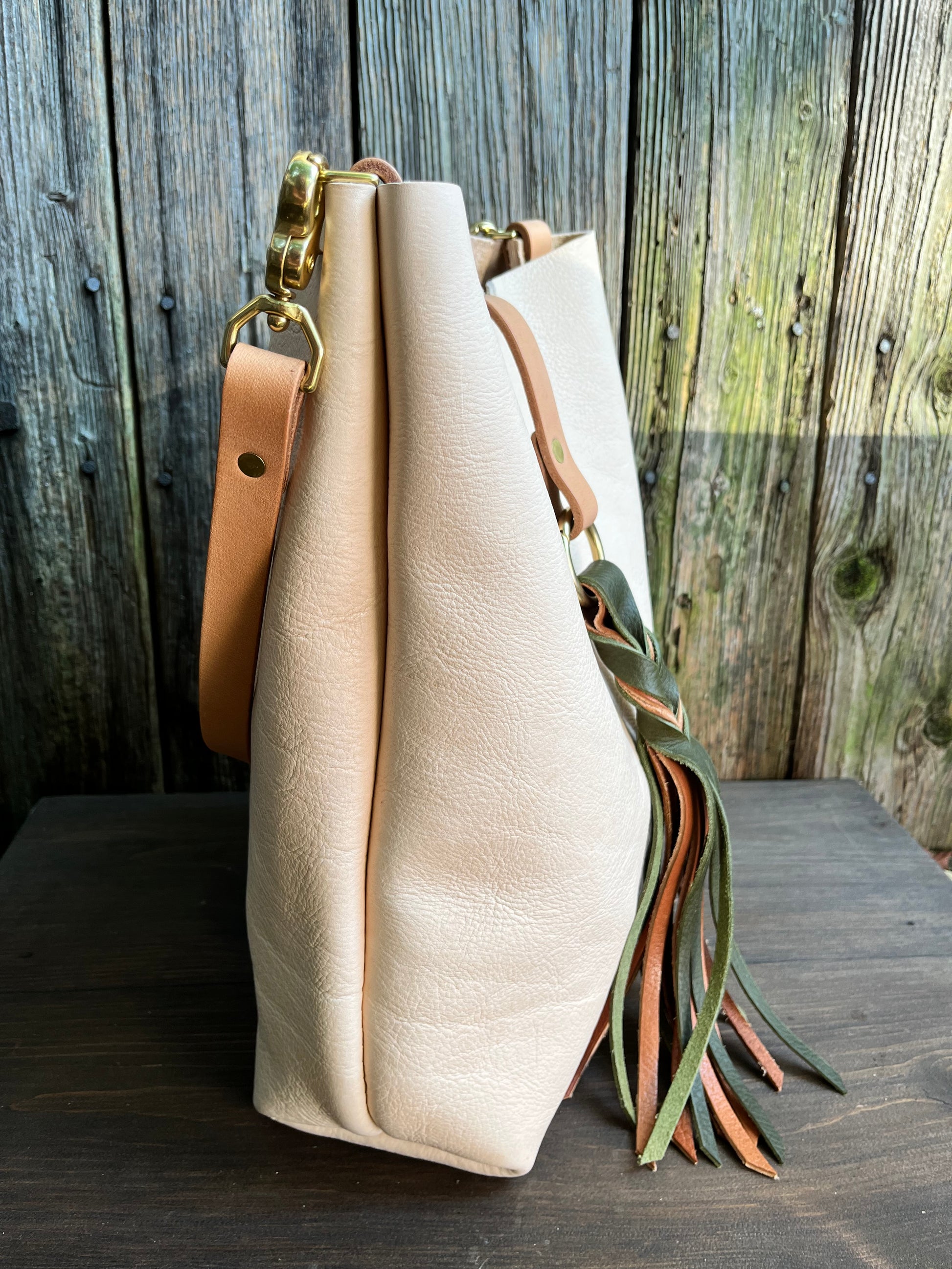 Barcelona Bucket in natural milled veg tan with throwover braided tassel…raw, trendy, and stylish.