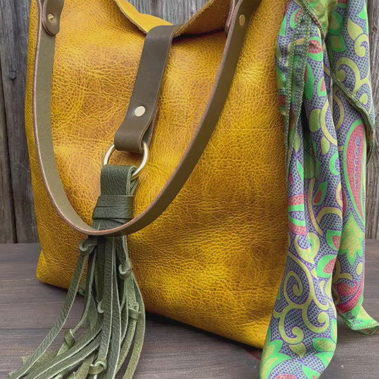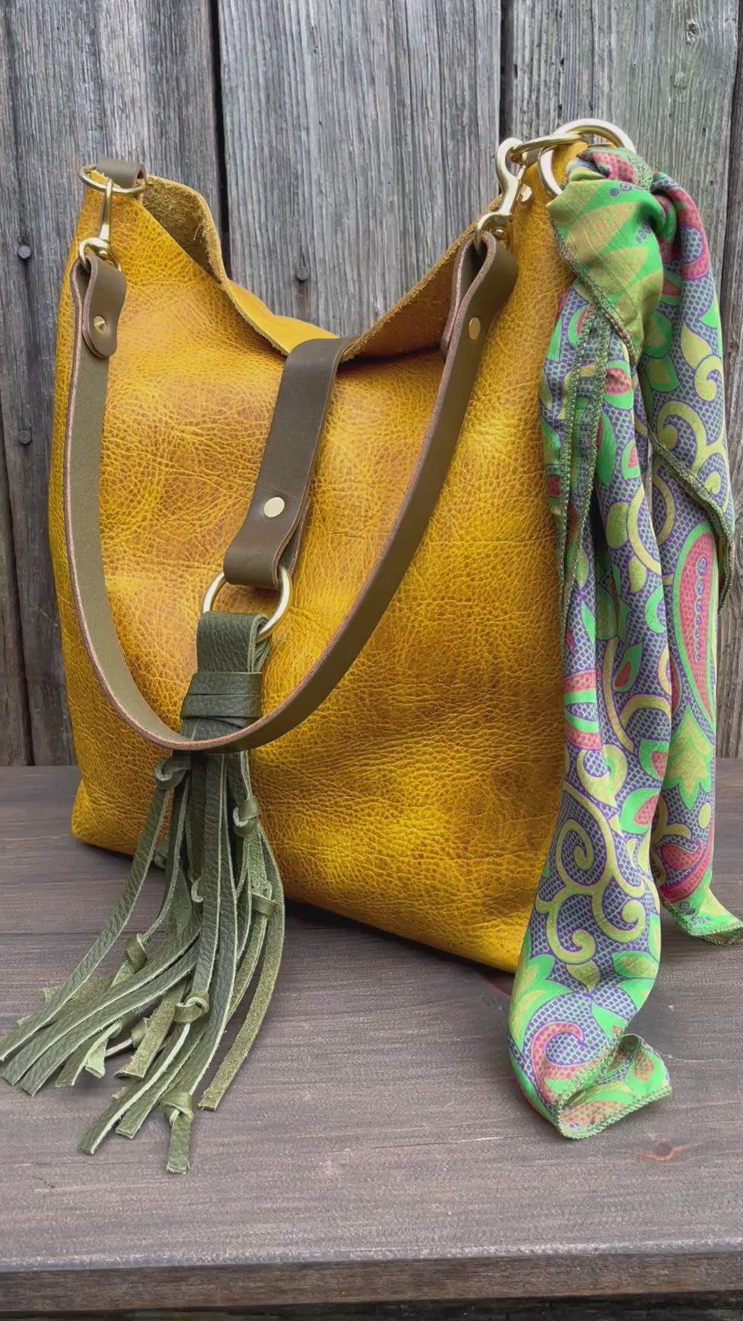 Barcelona Bucket in Golden Mustard bison leather with Olive Throwover Tassel, and silk scarf accessory…Raw, trendy, and stylish.