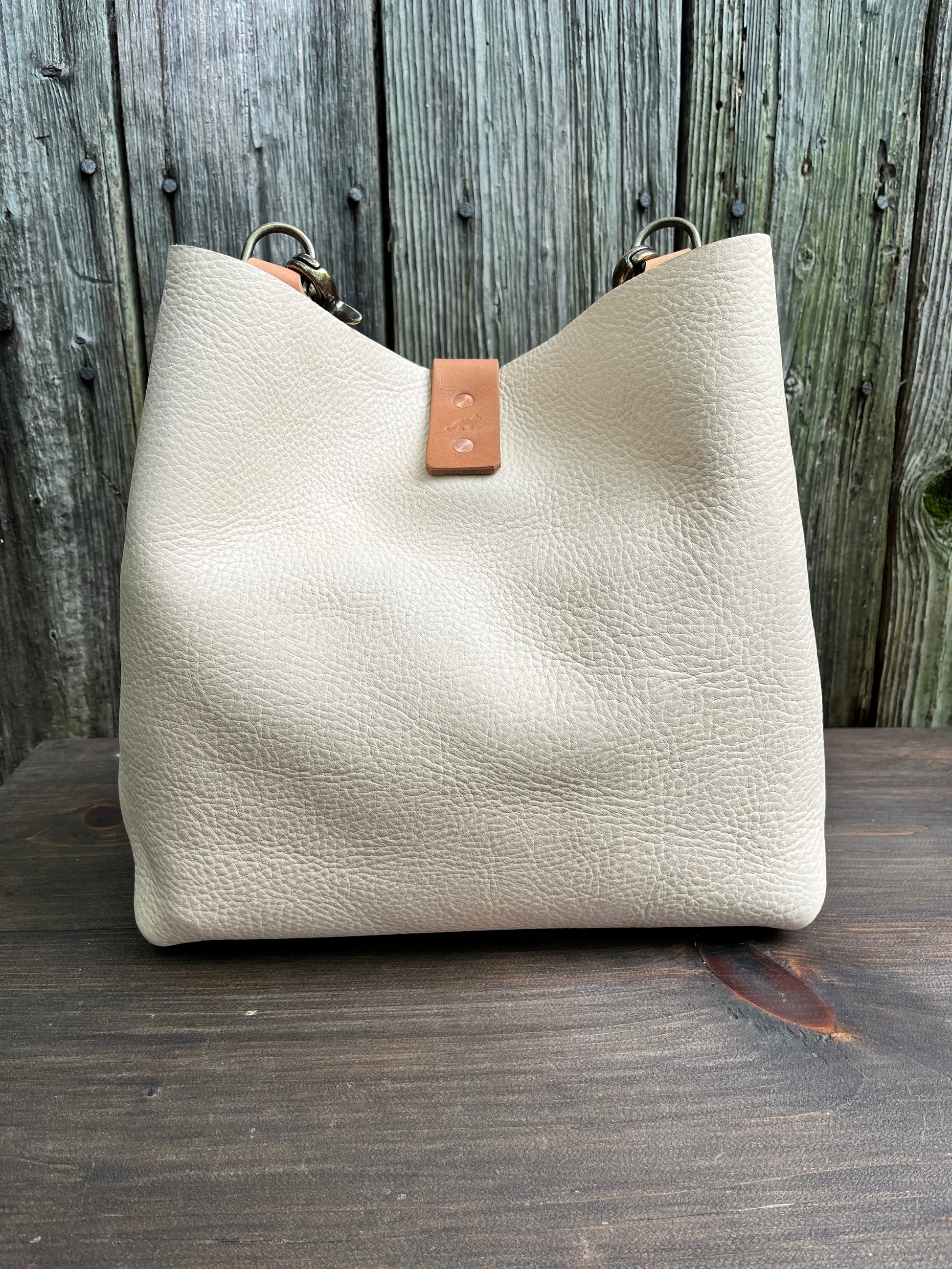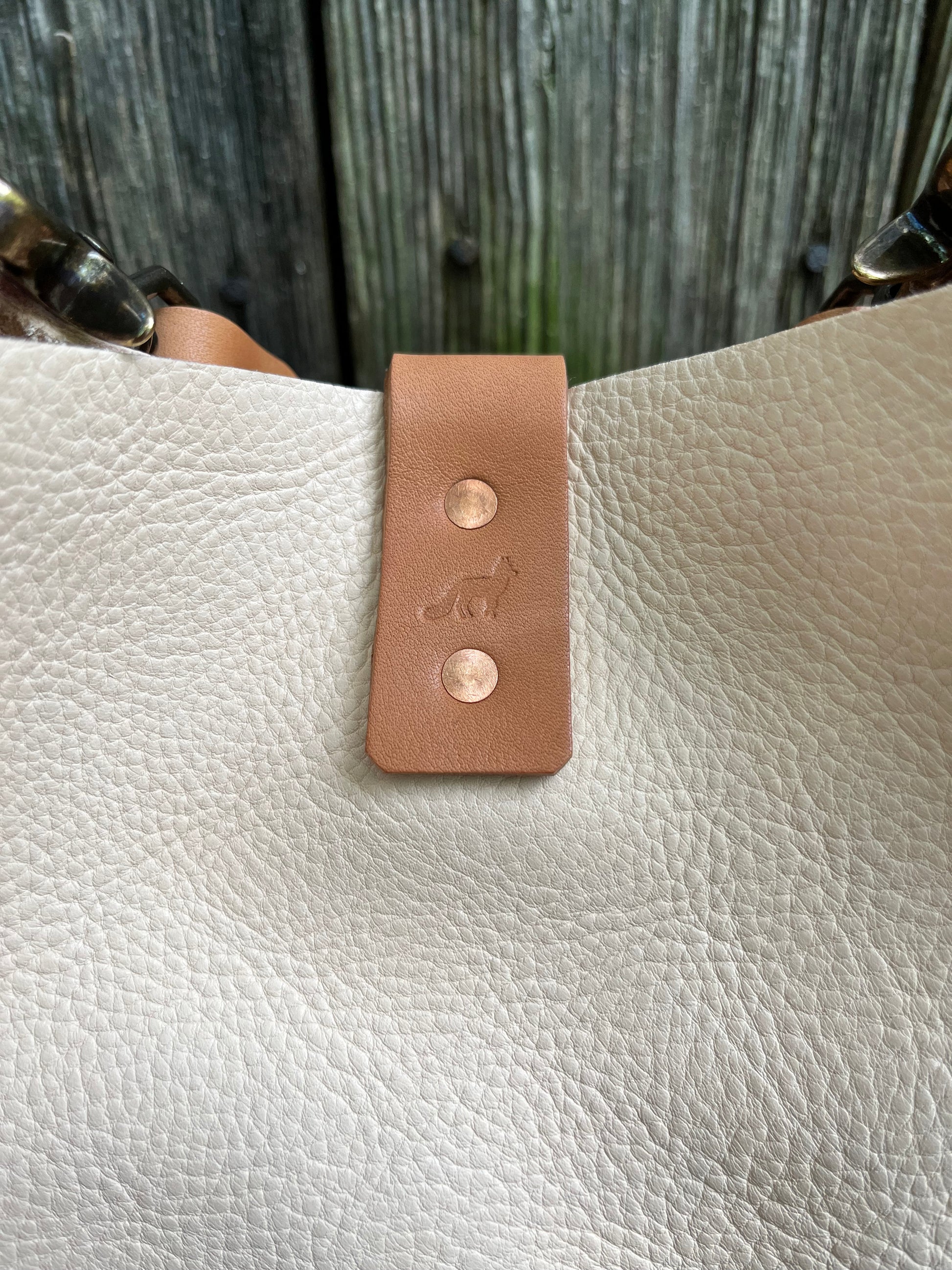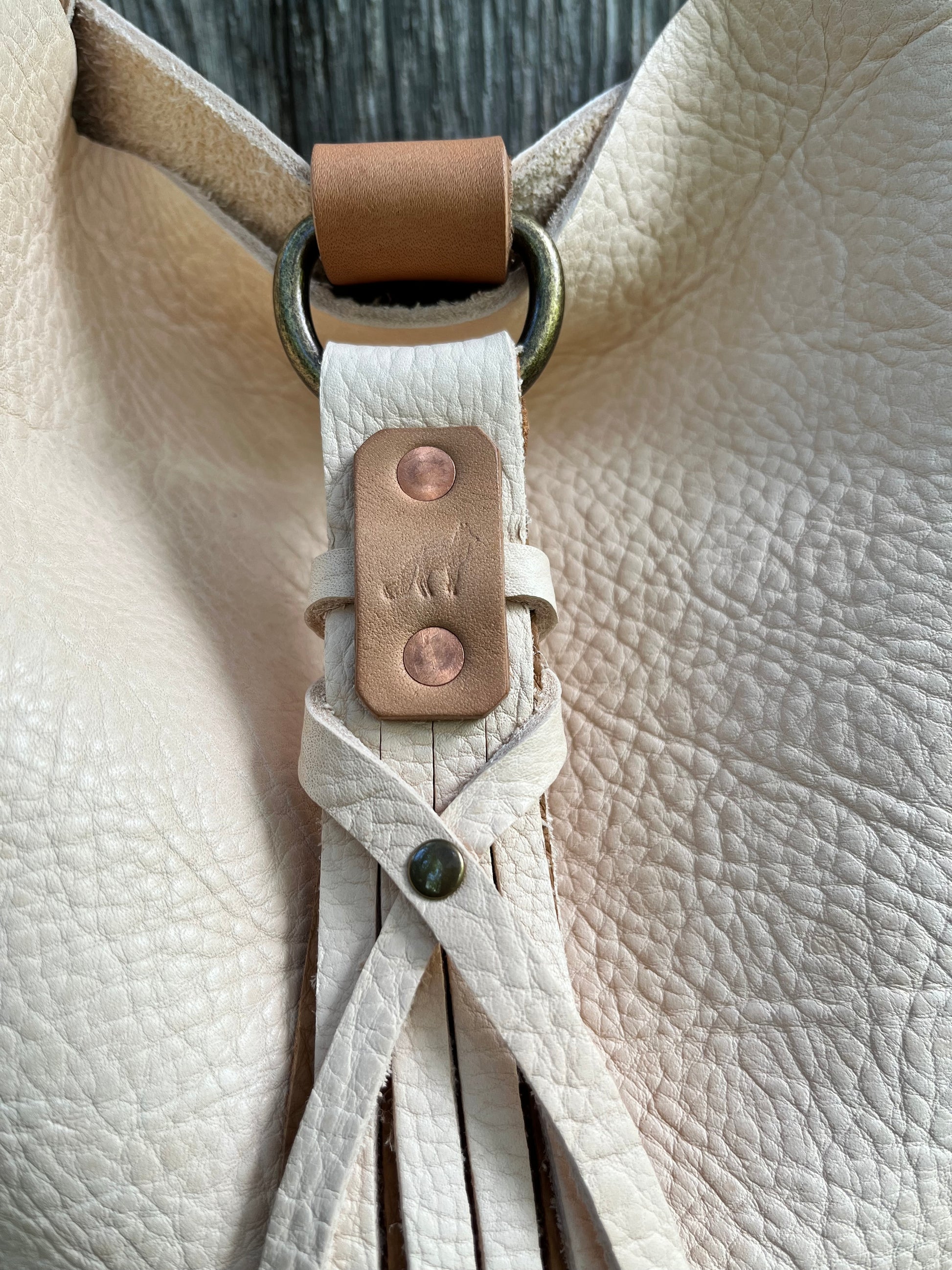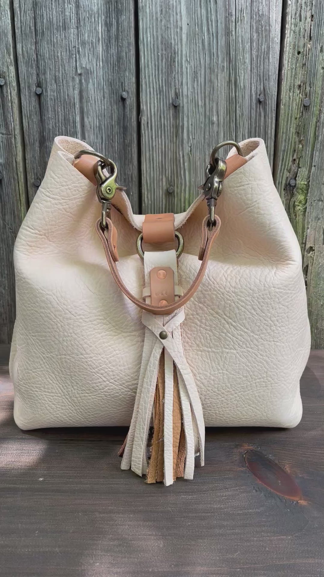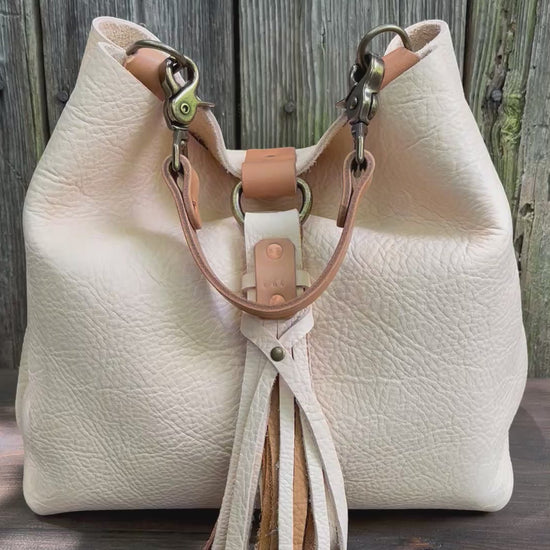 Barcelona Mini Bucket in Vanilla milled veg tan with Horween Essex Handle…raw, trendy, and stylish. Includes one of my handmade Fox tag tassels in Vanilla with a wee bit of Butterscotch peeking through!