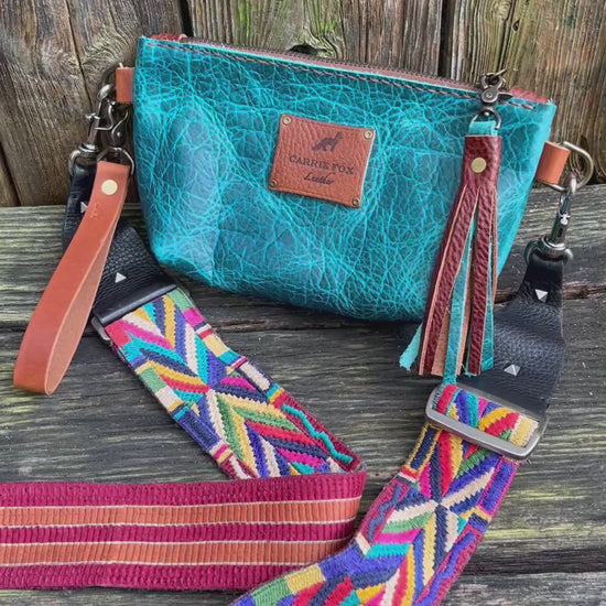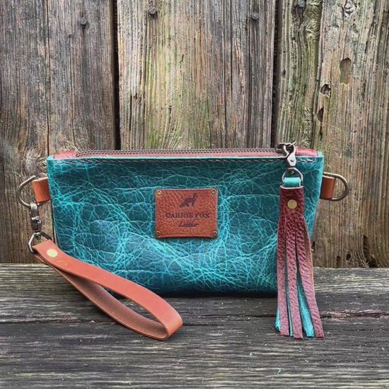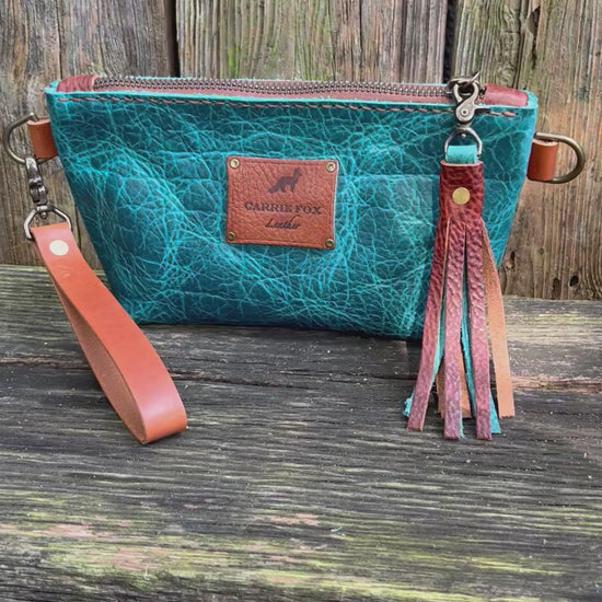 A mini version of my regular Pip wristlet (one inch smaller). Can also be carried as a clutch, or worn over the shoulder/crossbody with longer strap.